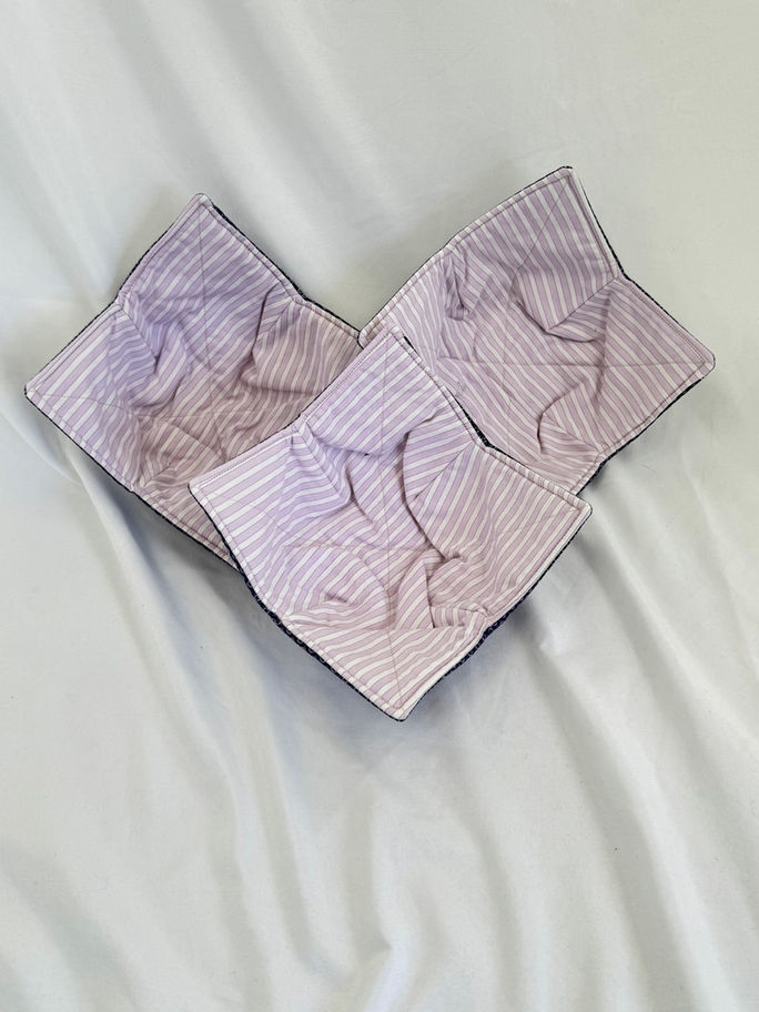 Each bowl cozy is individually crafted—whether made from specially selected cotton fabrics or upcycled men's shirts, no two are exactly alike. The fabric patterns and color combinations make each one unique.